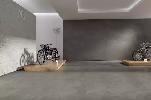 Vista, eine Keramikfliese mit Zementstruktur, die sich sowohl für den Innen- als auch für den Außenbereich eignet, verleiht Räumen Modernität.